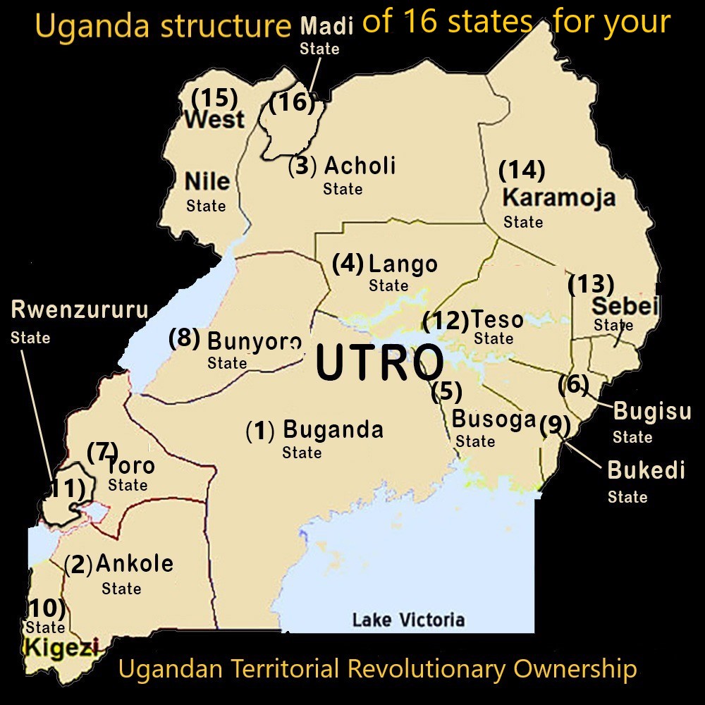 The Black sovereignty territorial state map of 16 Uganda states within Black continent on this Universe of the Almighty God.The road map guidance for Uganda structure of UTRO stands for Ugandan territorial revolutionary ownership empowered by BCO stands Black continent organisation of Black scientific revolution for you Abantu humans of Abantu population/Banilotiki humans of Banilotiki population of your entire Black population to re-organise yourselves and take back the ownership of your Black sovereignty territorial state of 16 Uganda states out of the hands of Himatic mix parasitic foreigners of Tutsis, Eritreans, Ethiopians, Somalians and Djiboutis led by Museveni/Muhoozi/Salim saleh/Jenet museveni/Rukirimana/Itungo berbie of which they hijacked your Black sovereignty territorial state of 16 Uganda states within Black continent on this Universe of the Almighty God since 1986 and up-to-date back into your hands as the natural owners of your Abantu Ancestors of your Abantu population/Banilotiki Ancestors of your Banilotiki population of your entire Black population in your Black human image derived out of Black word of the Almighty God out of unknown source for uncountable trillion years ago within Black continent on this Universe of the Almighty God! (BCO) Black continent organisation and its (BROS) Black revolutionary organised structure of (UTRO) Ugandan Territorial Revolutionary Ownership for your Uganda territory organised by Black revolutionary organiser as Omuntu-Omuganda human servant of the Almighty God born in Buganda state as one of Black sovereignty territorial state of 16 Uganda states to educate,inform and re-organise the entire Abantu population of Abantu humans and Banilotiki population of Banilotiki humans of your entire Black population within your Black sovereignty territorial state of 16 Uganda states to re-organise yourselves and take back the ownership of your Black soveregnty territorial state of 16 Uganda state out of the hands of Hima-Tutsi foreign parasitic invader/hijacker/ terrorist government led by the Chief Hima-tutsi foreign parasitic terrorist commander Museveni to abolish it and replace it with your Black sovereignty territorial federal state government of 16 Uganda states led by your fellow Omuntu federal president or Anilotiki federal president not like an Hima-tutsi foreign parasite Museveni of an Hima-tutsi foreign parasitic invader/hijacker/terrorist as Non-owoccupier of your Black soveregnty territorial state of 16 Uganda state originally for Yemen territory within Middle East continent either came Eritrea, Ethiopia, Somalia, Djibouti or Rwanda but he is not unknown where exactly he came from, who hijacked Black soveregnty territorial state of 16 Uganda states with his Hima foreign parasitic invader/hijacker/ terrrist group of NRA since 1986 and up-to-date!!. (BCO) Black continent organisation and its (BCRS) Black revolutionary organised structure of (UTRO) Ugandan Territorial Revolutionary Ownership for your Uganda territory educates and informs you all Abantu humans/Banilotiki humans to know about abolished destructive words/systems of which evil humans of satan in Black human image, Brown human image and White human image use abolished destructive words/systems to confuse, dis-organise and mislead you Abantu humans/Banilotiki humans of your entire Black population to dis-organise yourselves and destroy yourselves within Black continent on this Universe of the Almighty God!!. All of you Abantu humans/Banilotiki humans take a note!!!.Satan uses Humans of Black human image, Brown human image and White human image to set up satanic abolished destructive words as satanic abolished destructive words to confuse you Abantu humans/Banilotiki humans of your entire Black population to subject and embrace all satanic words of massive destruction against your entire Abantu population/Banilotiki population of your Black population and Obuntunism and reject by yourselves your own Obuntu human systems and Bunilotikinism of your own Bunilotiki human systems as your Black human identity in your Black human image within your Black continent owned by Black key word on this Universe of the Almighty God. This is (BCO) Black continent organisation and its (BROS) Black revolutionary organised structures headed by Black key word of the Almighty GodBlack continental map on this Universe!!!